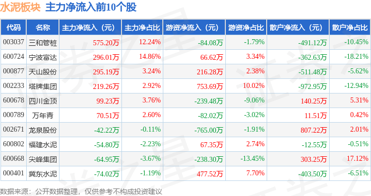 从资金流向上来看,当日水泥板块主力资金净流出2.38亿元,游资资金净流入9776.38万元,散户资金净流入1.41亿元。水泥板块个股资金流向见下表: