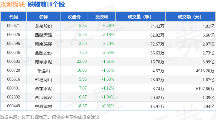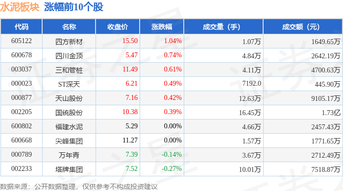 证券之星消息,11月1日水泥板块较上一交易日下跌1.16%,龙泉股份领跌。当日上证指数报收于3023.08,上涨0.14%。深证成指报收于9826.73,下跌0.38%。水泥板块个股涨跌见下表: