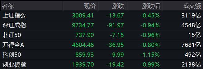 【A股三大指数集体收跌】上证指数跌0.45%,报3009.41点。深证成指跌0.94%,报9734.77点。创业板指跌0.99%,报1939.70点。传媒、手机游戏、网络游戏等板块领涨两市。太赫兹、卫星导航、6G概念等板块跌幅居前。(中新经纬APP)