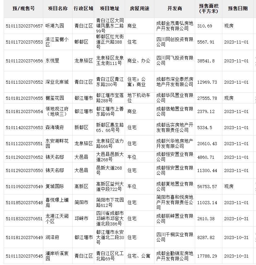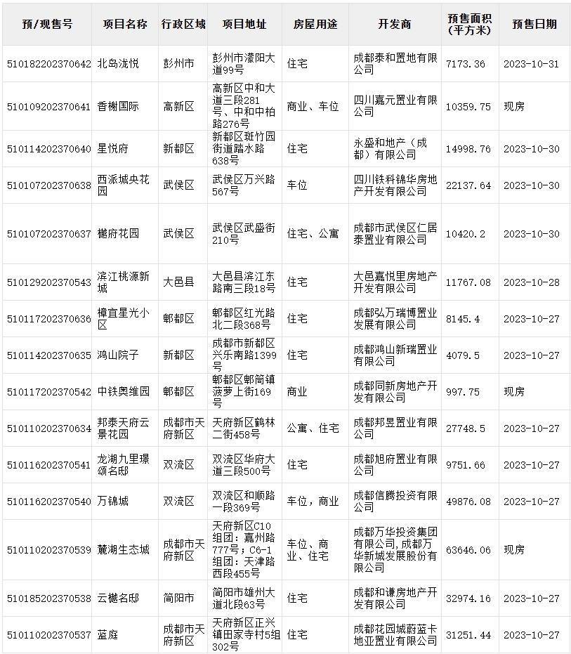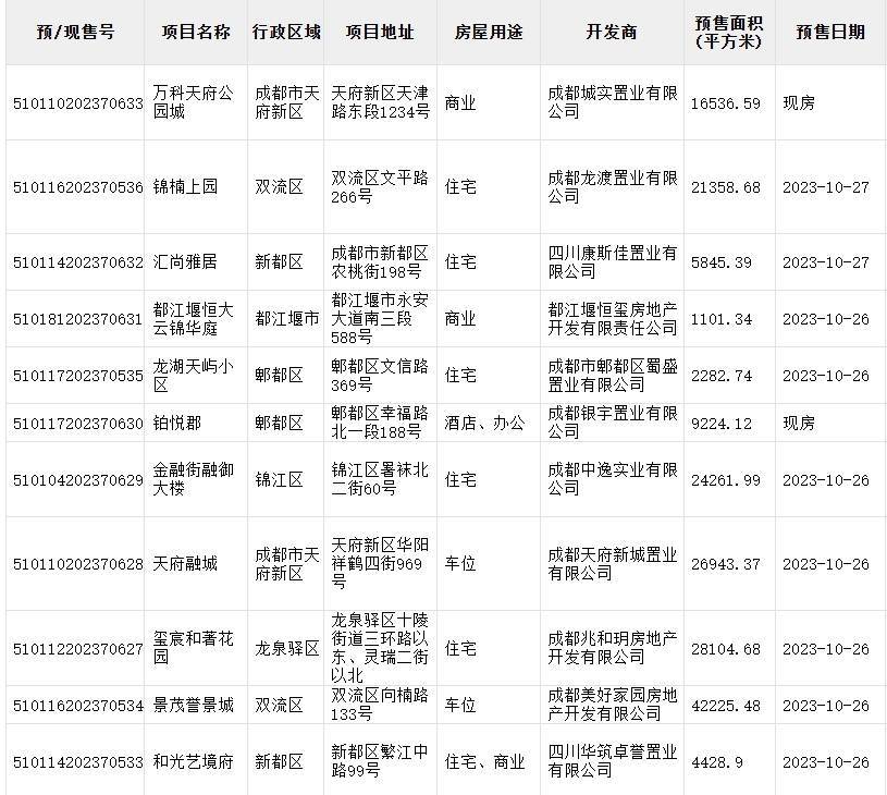 本周(10月26日-11月1日)大成都范围内,共有38个包含住宅、车位、商业、办公的项目取得预售证。