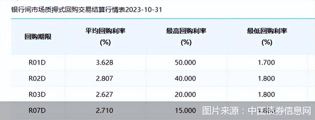 中国债券信息网显示,10月31日,银行间市场质押式回购品种R01D盘中一度出现50%的最高回购利率。当日银行间市场质押式回购交易品种中,R01D、R02D、R03D和R07D四款产品最高回购利率分别为50%、40%、20%和15%,这一数据为近年来阶段性高点。