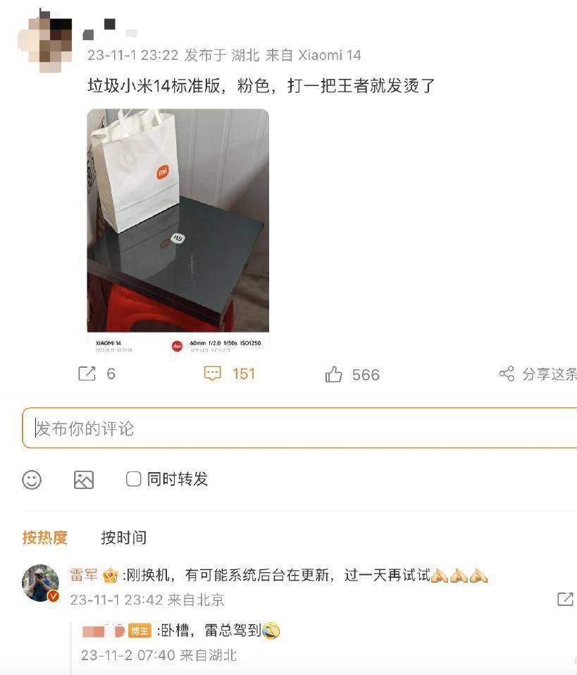 鞭牛士 11月2日消息,昨日,有购买小米14的用户发微博反映小米14存在发热问题:“打一把王者就发烫了”。随后,小米CEO雷军在评论区回复表示:“刚换机,有可能系统后台在更新,过一天再试试”。