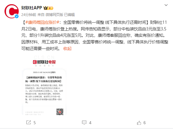 而据财联社消息,康师傅客服确认了涨价一事,称,确实有涨价通知。因原材料、用工成本上涨等原因,全国零售价将统一调整,线下具体执行价格调整可能还需要一些时间。