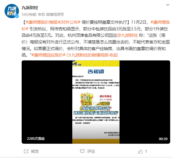对此,杭州顶津食品有限公司回应@九派财经 称:“这张(调价)海报没有对外进行正式公布,不清楚是怎么流露出去的,不能代表官方和全国情况。如果要正式调价,会针对具体的客户经销商,出具书面的盖章的调价告知函。”