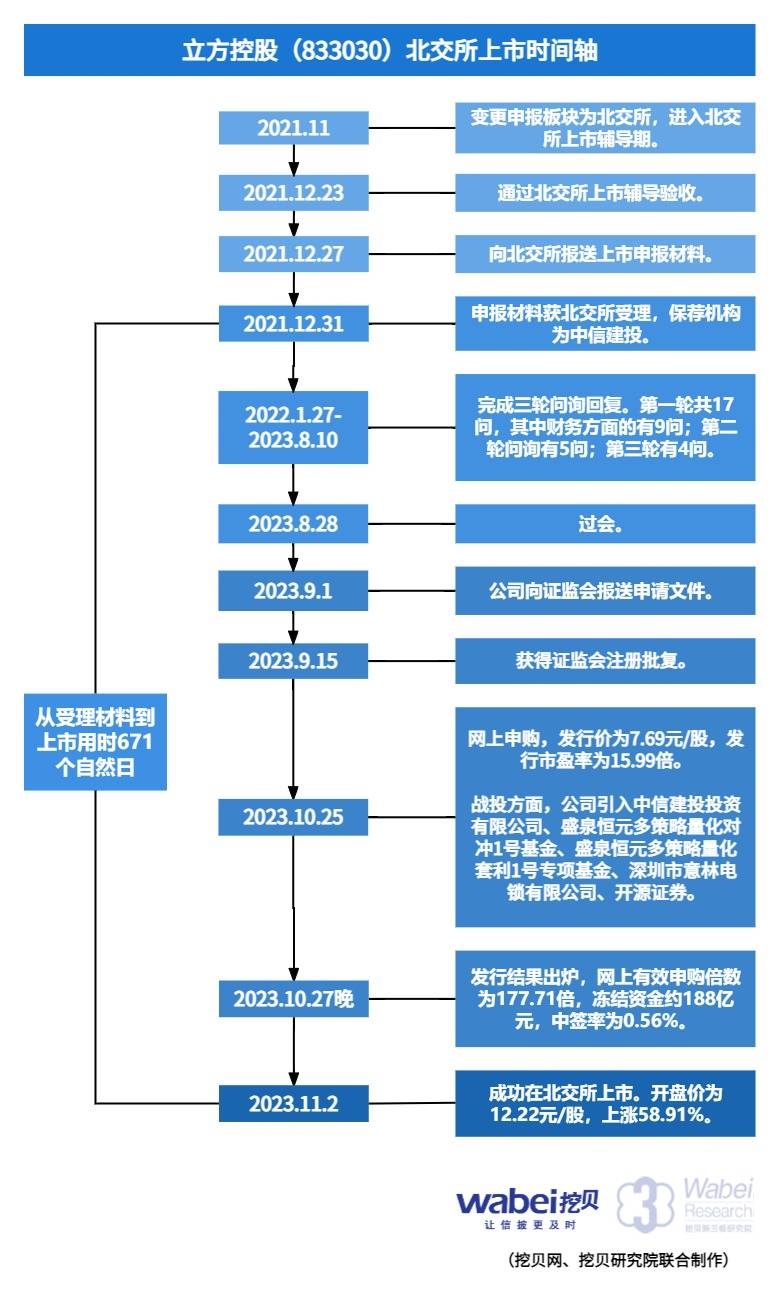 2022年1月27日-2023年8月10日,公司完成三轮问询回复,2023年8月28日过会,9月15日获得证监会注册批复,11月2日在北交所上市。