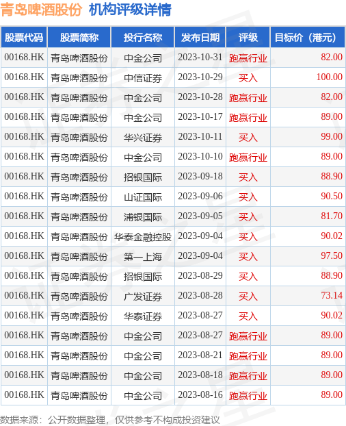 截至2023年11月2日收盘,青岛啤酒股份(00168.HK)报收于57.3港元,下跌1.21%,换手率0.29%,成交量192.31万股,成交额1.1亿港元。投行对该股的评级以买入为主,近90天内共有10家投行给出买入评级,近90天的目标均价为88.76港元。中金公司最新一份研报给予青岛啤酒股份跑赢行业评级,目标价82港元。