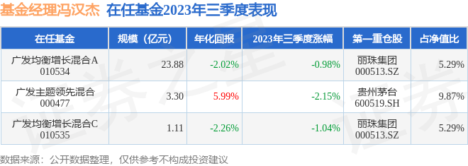 证券之星消息,截止2023年三季度末,基金经理冯汉杰旗下共管理3只基金,本季度表现最佳的为广发均衡增长混合A(010534),季度净值跌0.98%。