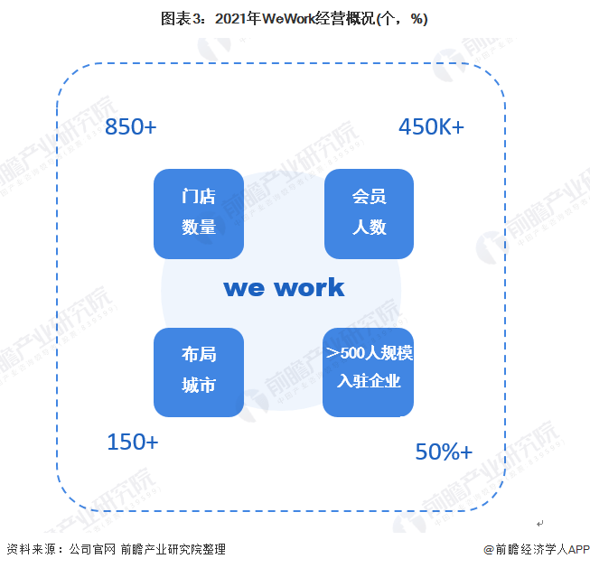 截至2021年,WeWork于全世界150+个城市设立超过850个门店,会员人数超过45万,大于500人规模企业占整体入驻企业比例超过50%。