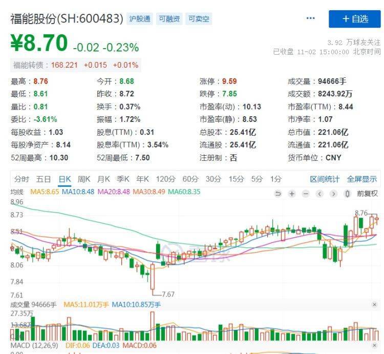 二级市场上,截至2日收盘,福能股份报8.70元/股,下跌0.23%,总市值221.06亿元。