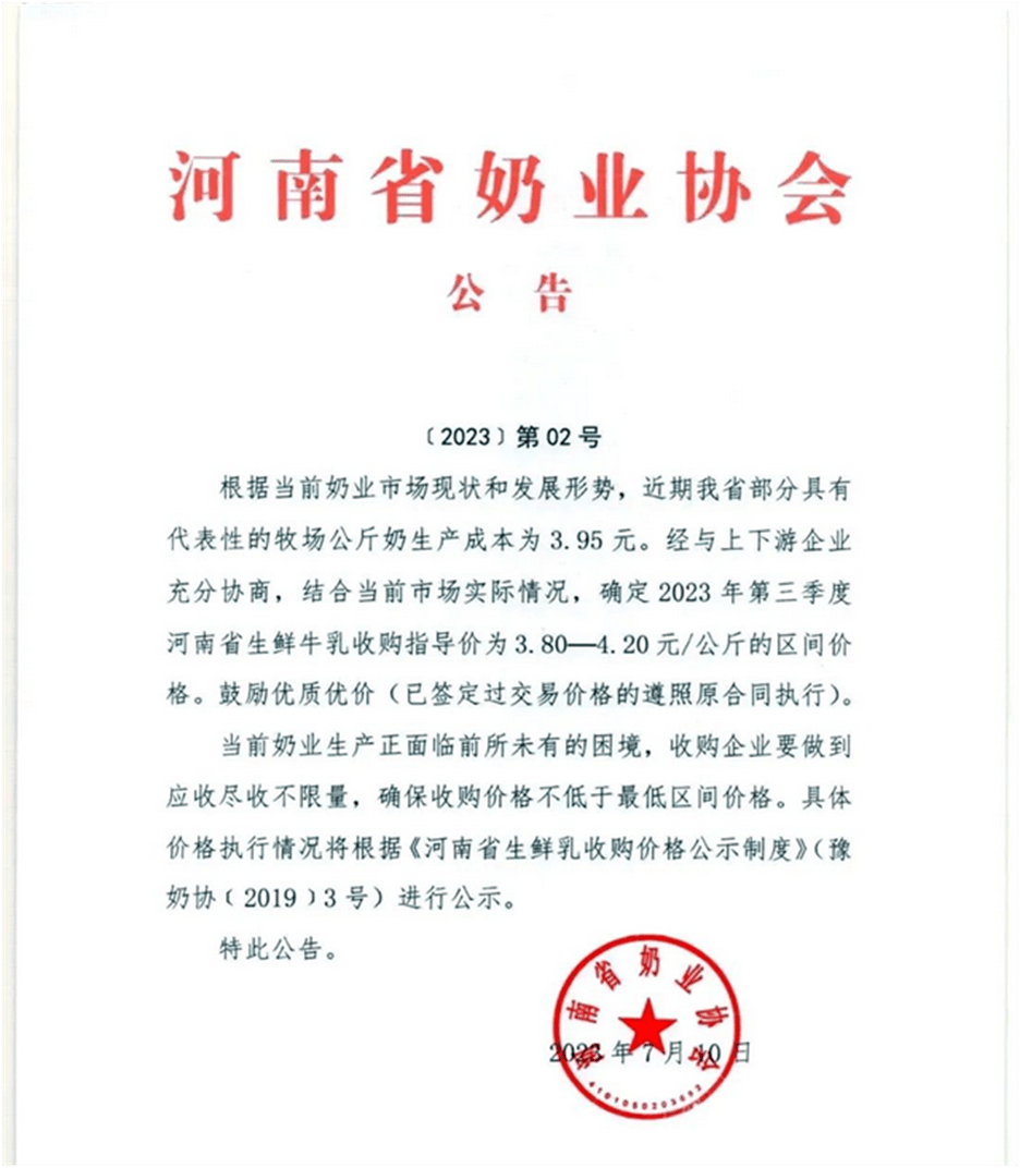 今年7月10日,河南省奶业协会发出公告称,确定2023年第三季度河南省生鲜牛乳收购指导价为3.8元/公斤至4.2元/公斤。河南奶协表示,当前奶业生产正面临前所未有的困境,收购企业要做到应收尽收不限量,确保收购价格不低于最低价格区间。