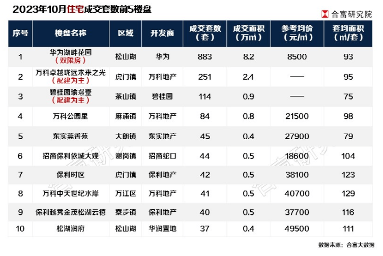 10月东莞新房网签套数排名前三位依次是华为湖畔花园、万科卓越珑远未来之光、碧桂园瑜璟臺,网签房源以双限房和配建房为主。