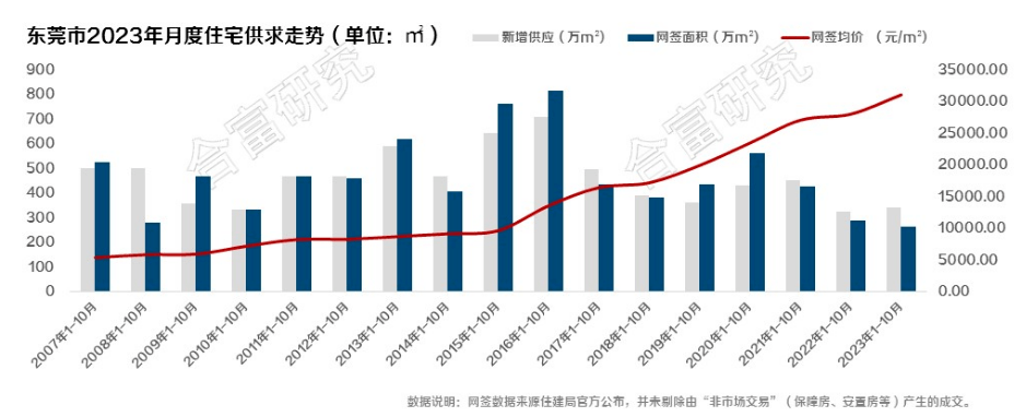成交方面,据合富大数据显示,10月东莞新建商品住宅网签约30万㎡、2705套,环比9月减少23%,同比去年10月减少约13%。剔除华为湖畔花园、碧桂园瑜璟臺回迁房等特殊房源后,网签面积约21万㎡,环比减少25%,规模处于年内中低位水平。