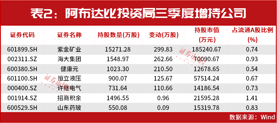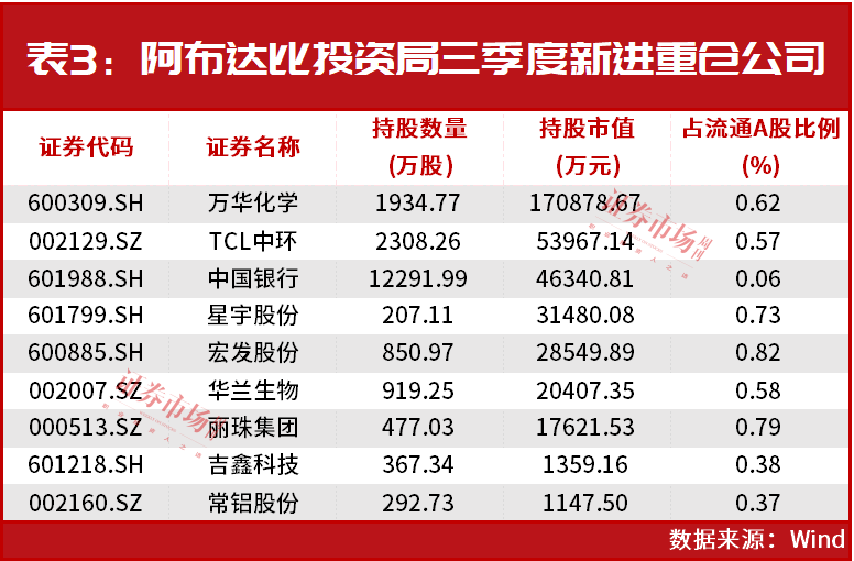 据Wind数据统计,三季度末,阿布达比投资局共现身于24家公司的大股东名单,合计持仓95.09亿元。三季度期间,阿布达比投资局继续增持了7家公司(见表2),对9家公司完成了新进重仓(见表3)。
