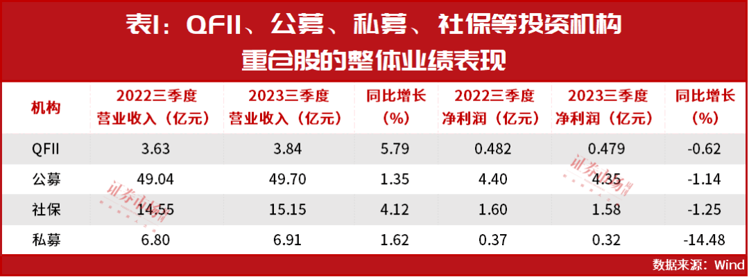 同时,这些公司以业绩为导向的低估值、绩优行业龙头居多。如在全部A股前三季度营业收入整体同比增长2.15%,归母净利润整体同比下滑2.87%的背景下,804只QFII重仓股营业收入整体同比增长5.79%,归母净利润整体下滑0.62%,不但均优于全A均值,相较公私募基金、社保基金等国内主流投资机构,QFII对于重仓标的的业绩要求也明显更高(见表1)。