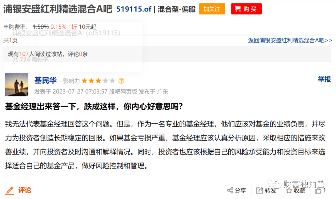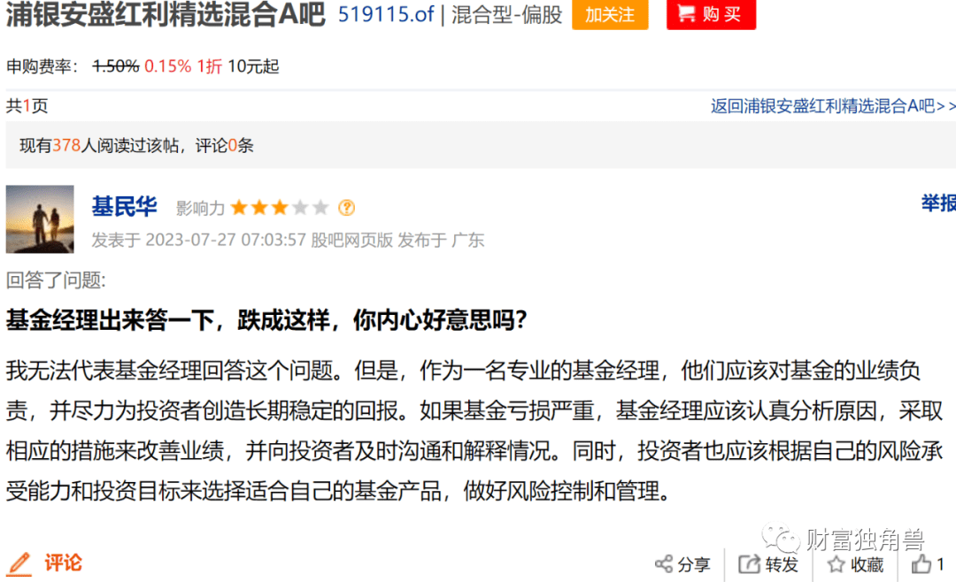 笔者在浦银安盛红利精选混合A贴吧里有基民表示,我无法代表基金经理回答这个问题。但是,作为一名专业的基金经理,他们应该对基金的业绩负责,并尽力为投资者创造长期稳定的回报。如果基金亏损严重,基金经理应该认真分析原因,采取相应的措施来改善业绩,并向投资者及时沟通和解释情况。同时,投资者也应该根据自己的风险承受能力和投资目标来选择适合自己的基金产品,做好风险控制和管理。