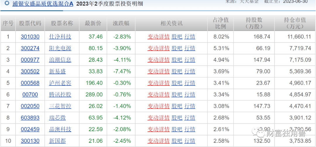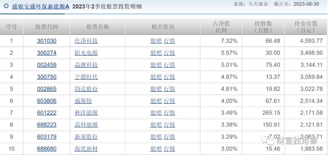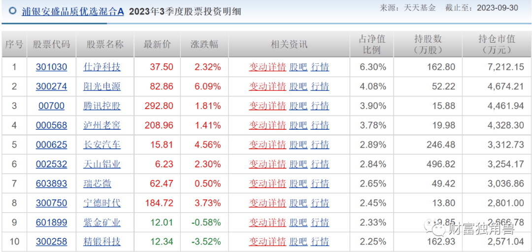 有基民问,第一重仓有红过么?笔者发现,仕净科技2023年1季度持有53.97万股,2023年2季度持有66.48万股,位列前十大重仓股第一位。2023年3季度仍然位列前十大重仓股第一名,但自6月29日10月23日仕净科技股票价格跌幅45%,如果3季度还持有仕净科技,那对基金业绩也会有影响。除了仕净科技外,该基金也一直持有晶澳科技,但2023年3季度该基金前十大重仓中,也没了晶澳科技的身影,低位卖出或许是基金业绩亏损的原因之一。