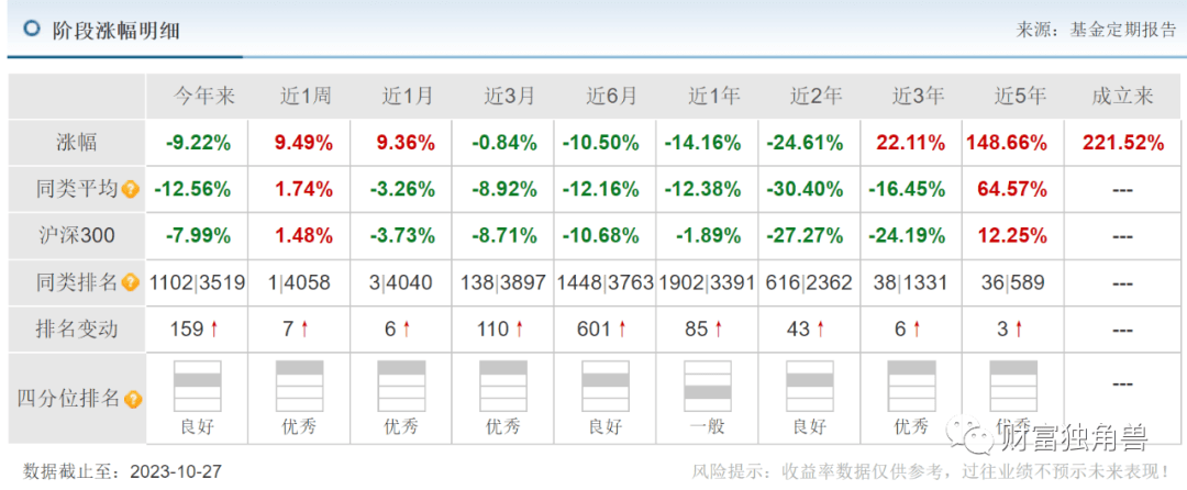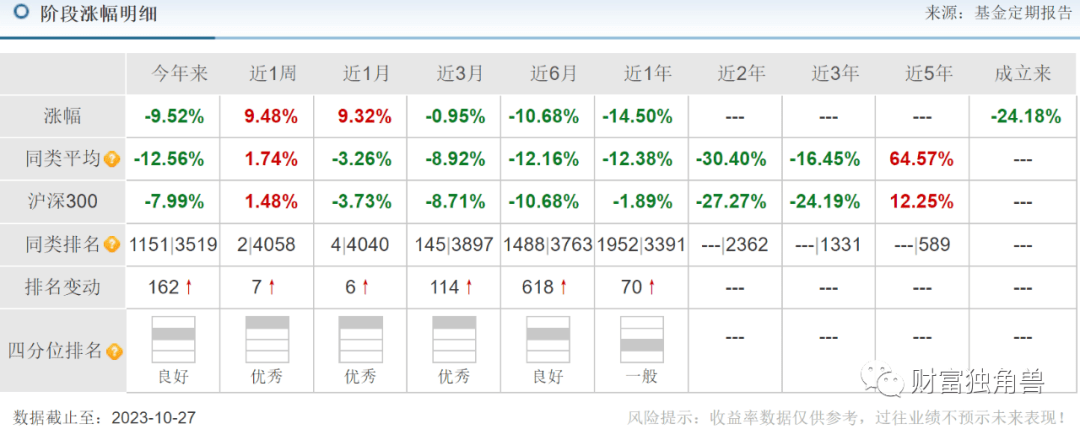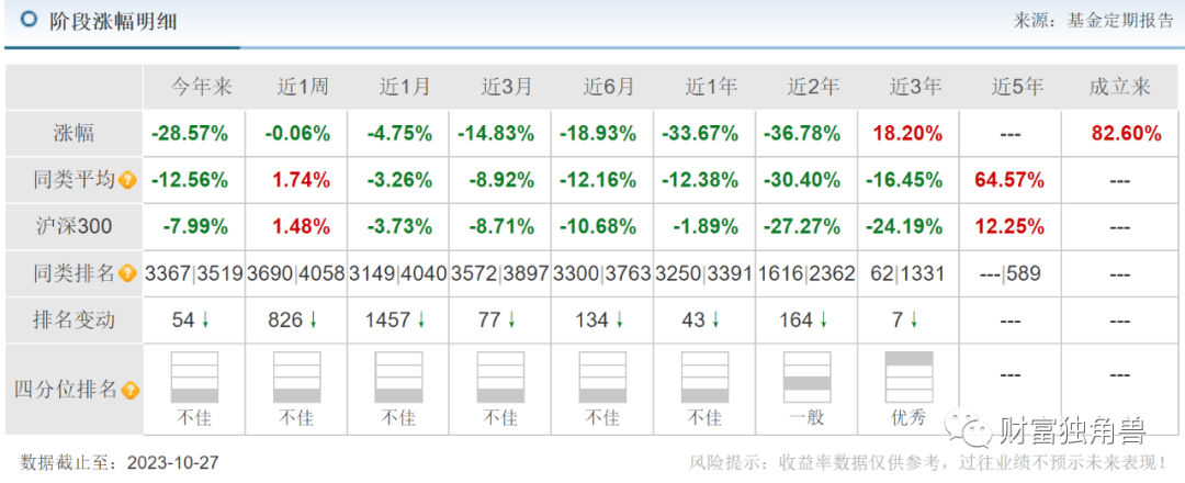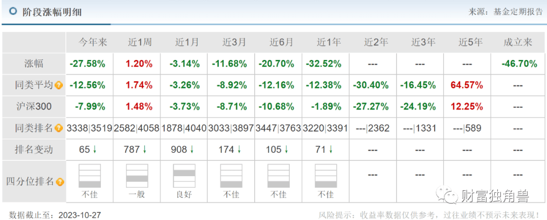 近3月来收益率-11.68%,近6月来收益率-20.70%,近1年来收益率-32.52%。笔者发现,该基金成立之初由蒋佳良管理,在其管理的194天,任职回报-2.02%。自2022年7月11日又换成蒋佳良与杨达伟共同管理,在其任职的1年又109天里,任职回报-45.60%。