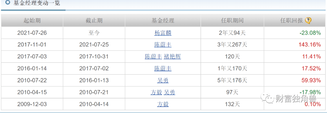 最初由蒋建伟管理,其管理的5年又124天,任职回报-4.10%;2020年7月13日-2021年7月25日由陈蔚丰管理,任职回报37.75%;但2021年7月26日-2023年3月2日又换成吴勇管理,任职的1年又219天时间,任职回报-27.36%;2023年3月3日至今,又换成杨富麟管理,管理的239天里,任职回报-12.51%。