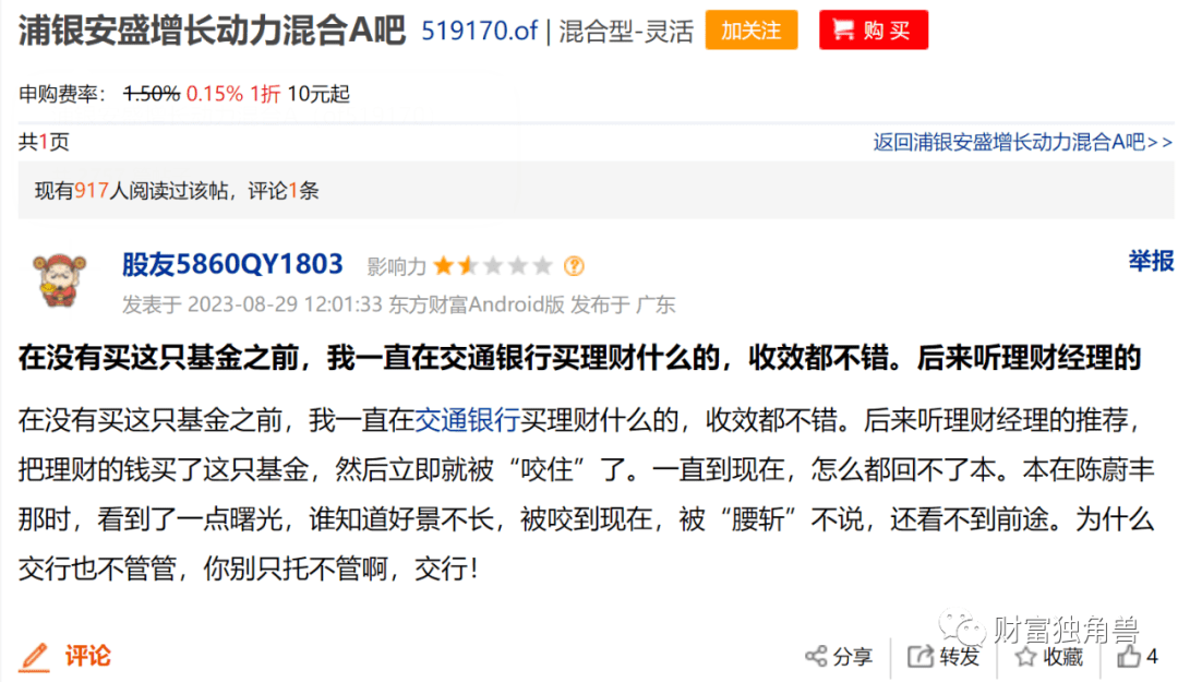 基金业绩亏损,有基民抱怨道,在没有买这只基金之前,我一直在交通银行买理财什么的,收效都不错。后来听理财经理的推荐,把理财的钱买了这只基金,然后立即就被“咬住”了。一直到现在,怎么都回不了本。本在陈蔚丰那时,看到了一点曙光,谁知道好景不长,被咬到现在,被“腰斩”不说,还看不到前途。为什么交行也不管管,你别只托不管啊,交行!有基民跟帖表示,我也和你一样,到交行办理业务,基金经理推荐买的。