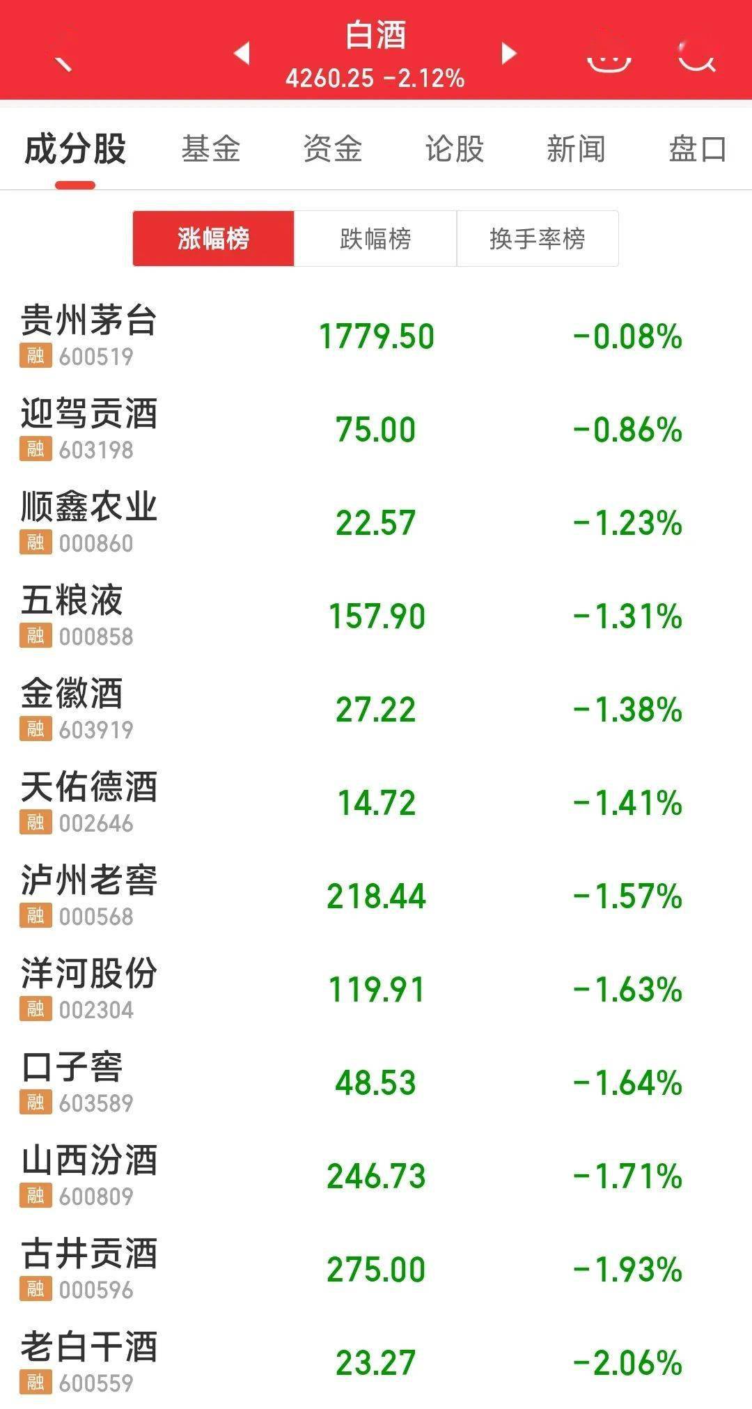 引人关注的是,昨日活跃的白酒股回调,板块内成分股股价均不同程度下跌。其中,贵州茅台报收1779.5元/股,跌幅最小,为0.08%;伊力特、水井坊、舍得酒业、金种子酒等跌幅靠前。