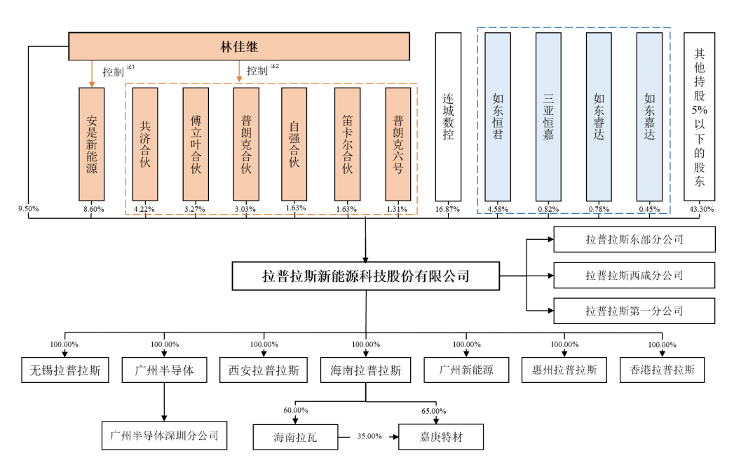 林佳继直接持有总股本的9.50%;其控制的安是新能源、共济合伙、自强合伙等持股平台合计持有23.70%。林佳继也因此拥有33.2%的表决权。