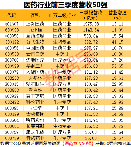 为诠释医药行业成长股的特质,数据宝根据三季报研发投入力度,机构关注度和未来成长性等维度,筛选出医药行业成长50强,条件如下: