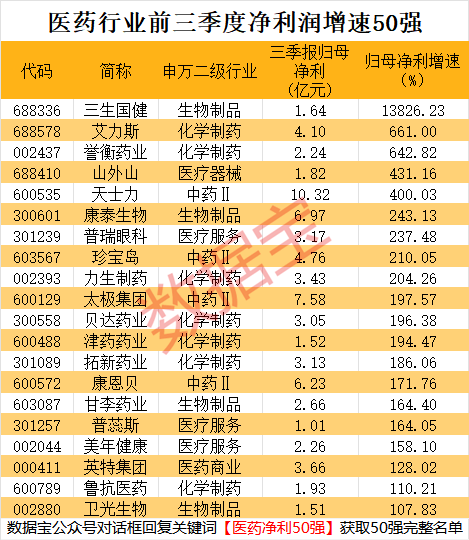 数据宝统计,前三季度净利润超亿元且同比增速超20%的50强公司中,化学制药、中药板块上榜公司数量较多,分别有16家、12家。自免行业龙头三生国健拔得头筹,公司深耕自免领域抗体创新研发,靶点布局丰富,在研管线进度靠前,逐步进入收获期。公司前三季度净利润暴增138倍。股价方面,公司今年以来涨超60%。
