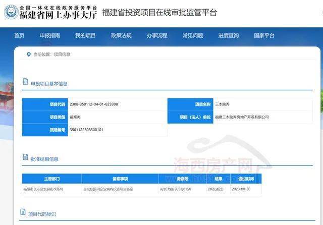 根据福建省投资项目在线审批监管平台发布消息显示,长乐2023拍-2号地块备案名为“三木映秀”,并于2023年8月30日备案报建。
