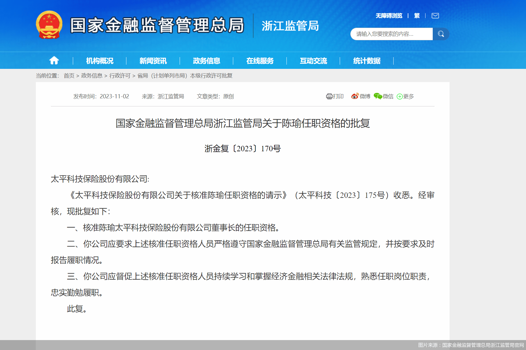 北京商报讯(记者 李秀梅)11月2日,国家金融监督管理总局浙江监管局发布关于陈瑜任职资格的批复称,核准陈瑜太平科技保险股份有限公司(以下简称“太平科技”)董事长的任职资格。