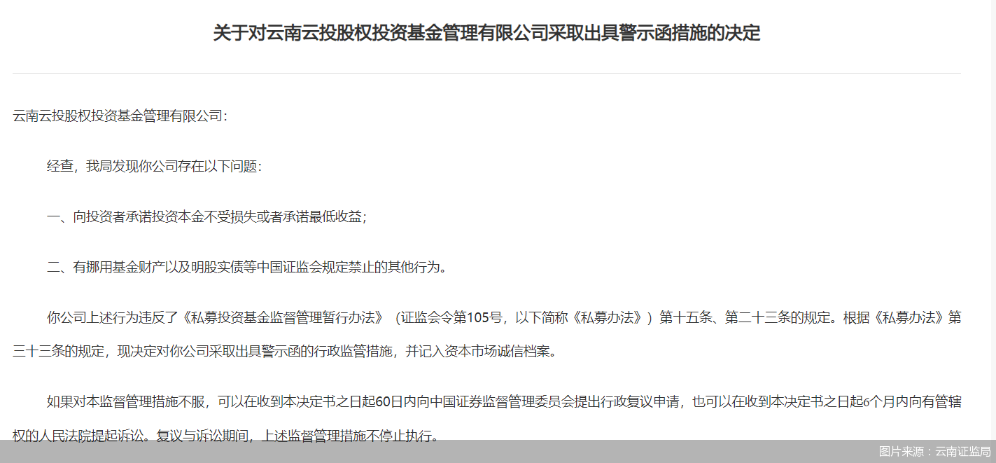 原标题:因存在承诺收益等问题 云投基金遭监管出具警示函