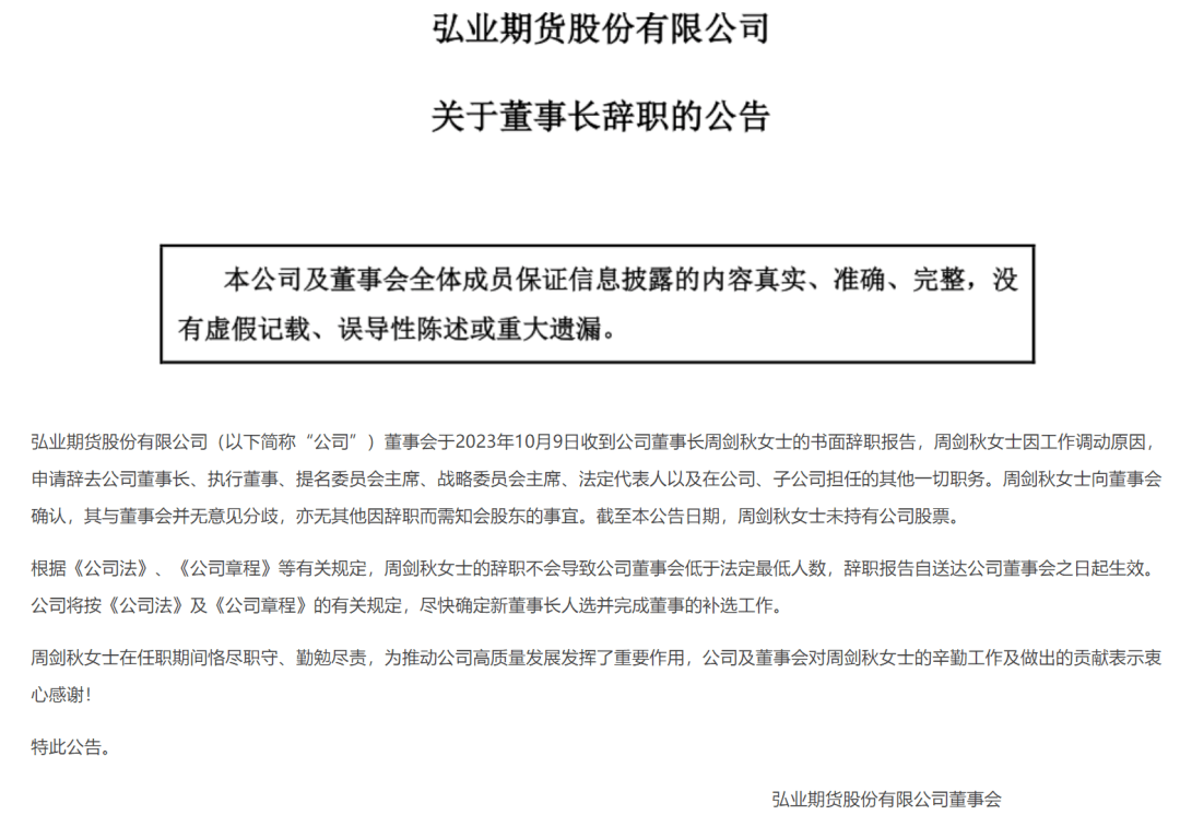 10月9日晚间,弘业期货发布公告称,董事会于10月9日收到公司董事长周剑秋的书面辞职报告,周剑秋女士因工作调动原因,申请辞去公司董事长、执行董事、提名委员会主席、战略委员会主席、法定代表人以及在公司、子公司担任的其他一切职务。