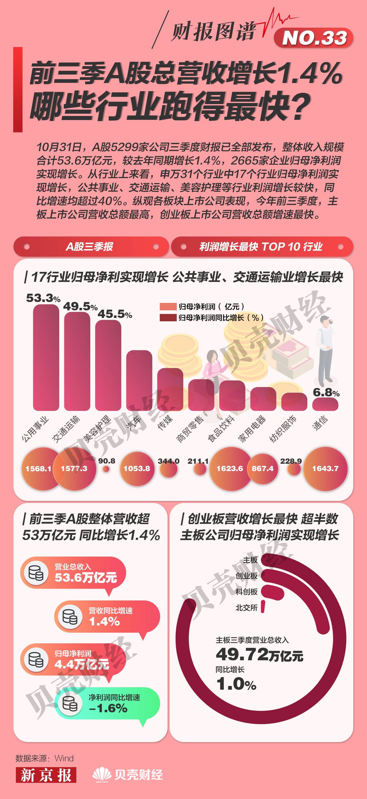 原标题:财报图谱㉝|前三季A股盘点:总营收增1.4% 哪些行业跑最快