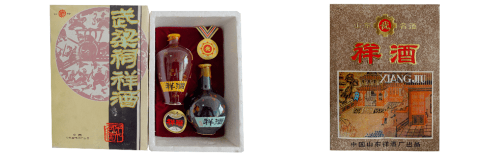 ②特优级祥酒:国营山东祥酒厂生产的54度酱香型白酒,瓶型为500ml陶瓷瓶,每盒两瓶,礼盒古色古香。