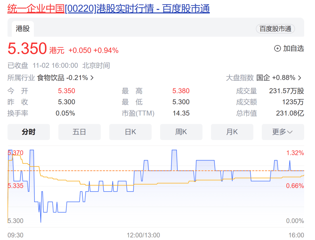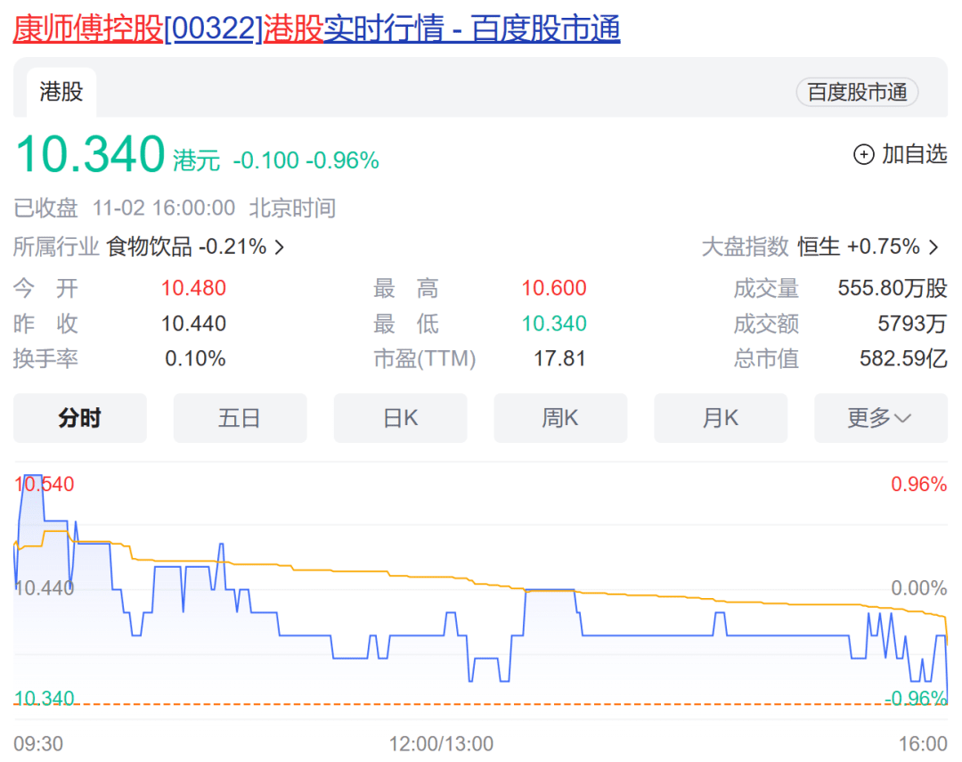 11月2日,港股康师傅控股报收10.34港元/股,下跌0.96%,总市值583亿港元。统一企业中国报收5.35港元/股,上涨0.94%,总市值231港元。