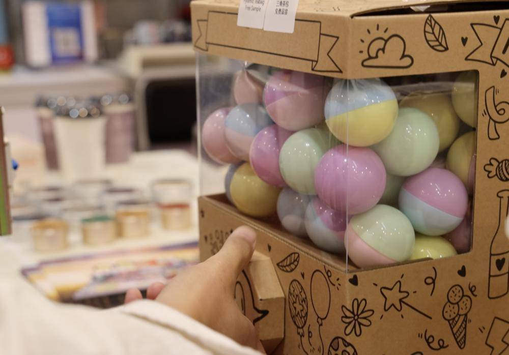 类似这样的对话,频繁发生在广交会第三期广东茶叶进出口有限公司的展位前。原来,该公司为了招揽路过的客商,在展位前摆放了一个用纸壳制作的茶包盲盒机,利用时下新潮的盲盒吸引人们注意。