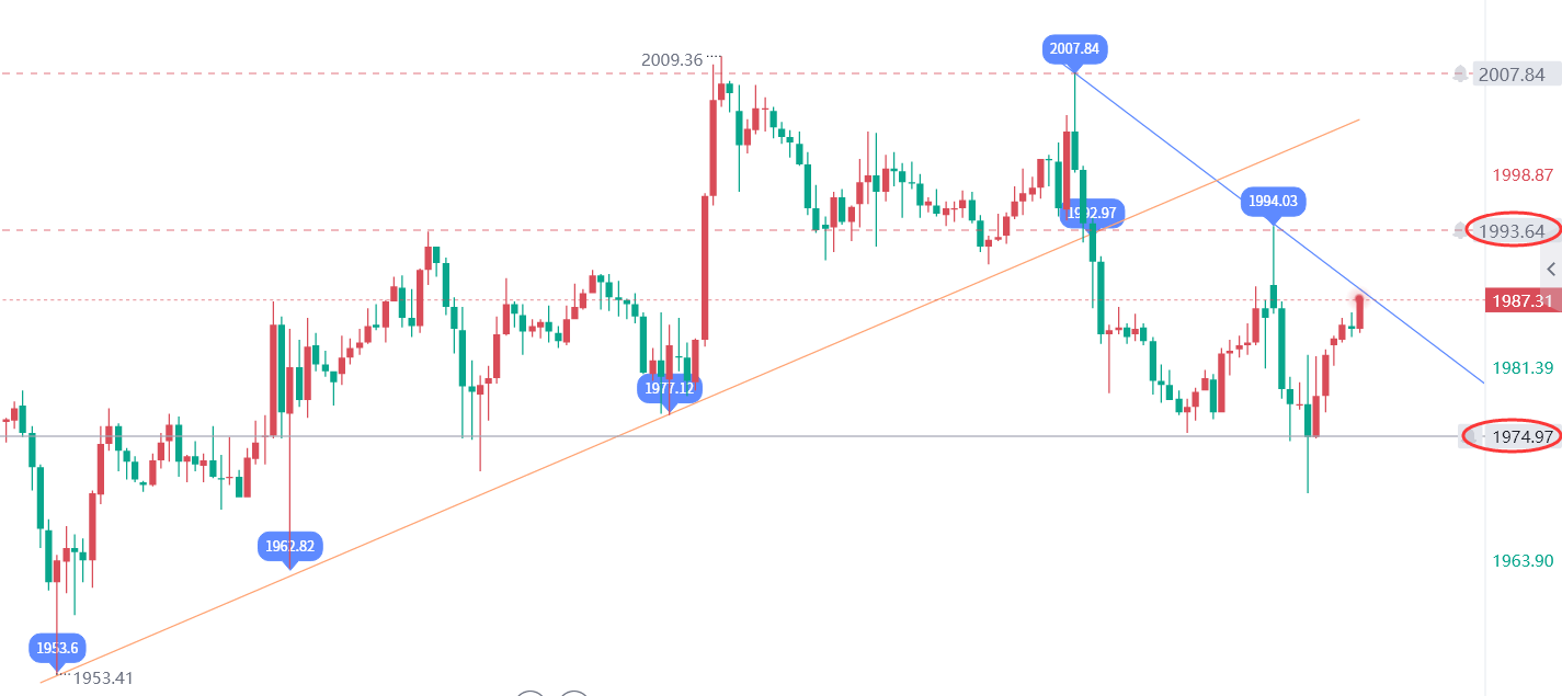 黄金操作建议:建议1988做空,止损放在1995,目标下看1975附近;跌势不延续可于下方1978附近做多,止损1972,目标上看1990附近。