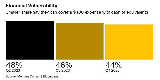 根据决策情报公司Morning Consult周四公布的一项调查显示,表示可以用现金或等价物支付400美元紧急开支的美国人比例连续第三季度下降。