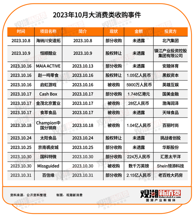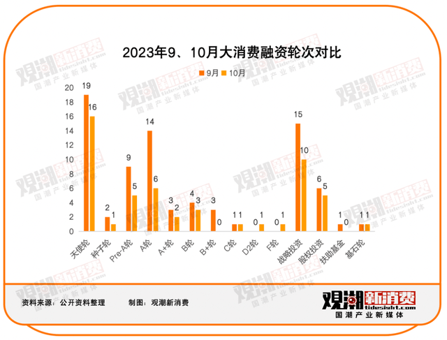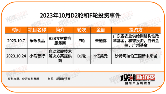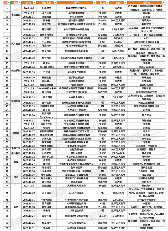 2023年10月,大消费领域投融资事件轮次仍以早期融资为主,其中A轮及以前轮次事件共28起,占比53.8%。相比上月,10月仍保持中后期投融资事件数量偏少的趋势,但新增D2轮和F轮投资,分别是「乐禾食品」10月7日完成的F轮融资,投资金额未透露,投资方为广东省农业供给侧结构性改革基金、和智投资、白云金控、广州基金;10月24日「小马智行」完成的1亿美元D2轮融资,投资方为沙特阿拉伯王国新未来城。