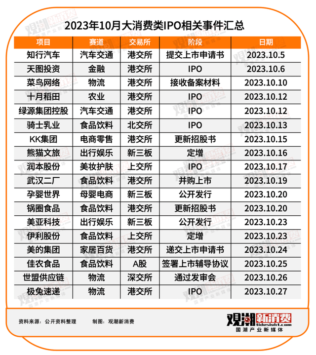 2023年10月大消费类企业共有18家企业进入上市阶段,6家已公开交易,7家正处准备阶段。