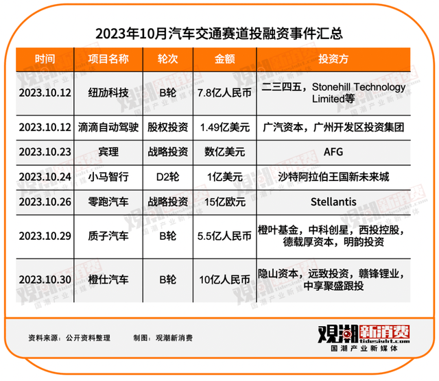 剔除未披露金额的投融资事件,汽车交通领域以7起融资事件、24.38亿元平均融资金额位居前列。该赛道10月产生的融资事件均为亿级事件,其中零跑汽车于10月26日完成的战略融资金额最高,高达15亿欧元(约合人民币115.95亿元),投资方为Stellantis。