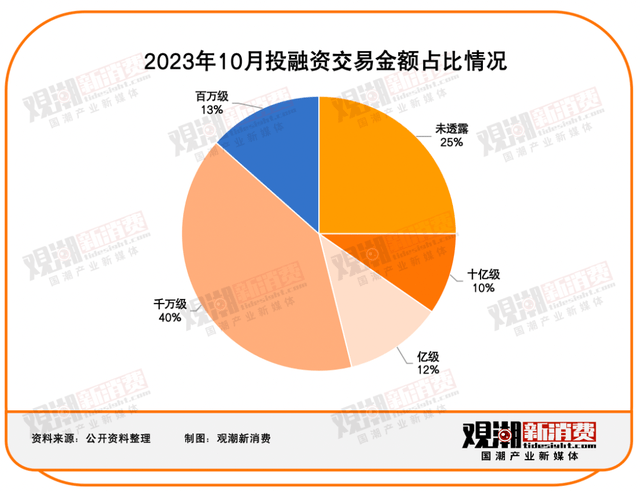 2023年10月,大消费类市场共发生融资事件52起,较9月减少25起。未披露融资金额的共有13起,其余融资金额合计约202亿元,较上月金额增加约76亿元。