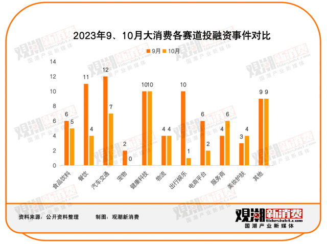 从综合水平来看,10月市场活跃度不如上月,除服务商和美妆护肤,其余赛道投融资事件数量均与上月持平或有所下降,尤其在餐饮和出行娱乐赛道,资本热情骤减,市场进入冷静期。