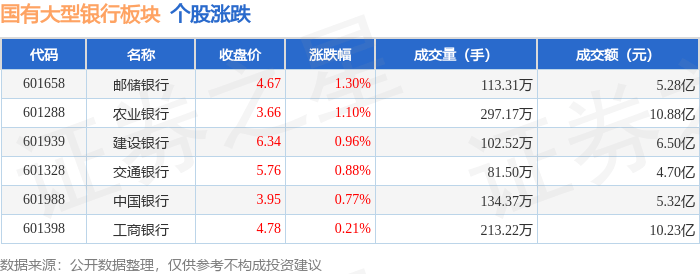 北向资金方面,当日国有大型银行板块北向资金持股市值为401.29亿元,增持4.39亿元。其中增持最多的是工商银行,增持了1.32亿元。国有大型银行板块北向资金持股变动明细见下表: