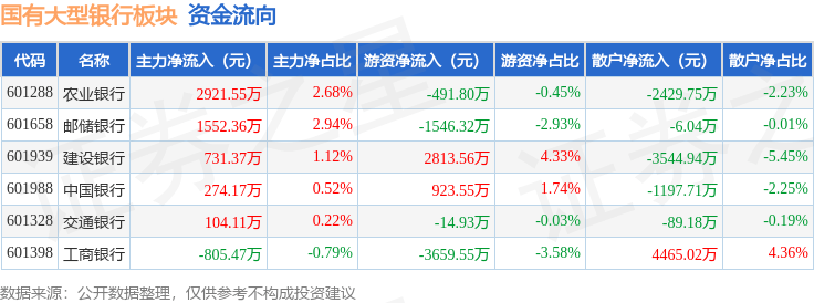 从资金流向上来看,当日国有大型银行板块主力资金净流入4778.08万元,游资资金净流出1975.49万元,散户资金净流出2802.6万元。国有大型银行板块个股资金流向见下表: