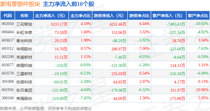 从资金流向上来看,当日家电零部件板块主力资金净流出2.85亿元,游资资金净流入2093.34万元,散户资金净流入2.64亿元。家电零部件板块个股资金流向见下表: