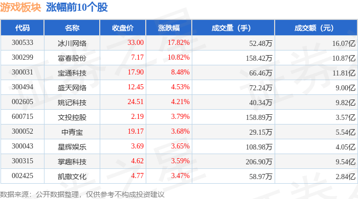 北向资金方面,当日游戏板块北向资金持股市值为164.54亿元,增持1.61亿元。其中增持最多的是世纪华通,增持了0.79亿元。减持持最多的是完美世界,减持了0.62亿元。游戏板块北向资金持股变动明细见下表: