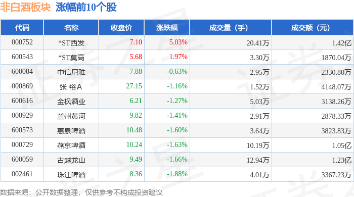 证券之星消息,11月2日非白酒板块较上一交易日下跌2.36%,重庆啤酒领跌。当日上证指数报收于3009.41,下跌0.45%。深证成指报收于9734.77,下跌0.94%。非白酒板块个股涨跌见下表: