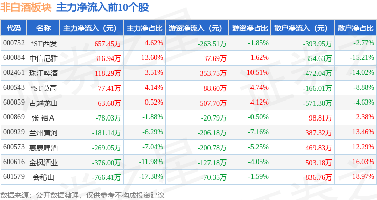从资金流向上来看,当日非白酒板块主力资金净流出1.25亿元,游资资金净流出2040.92万元,散户资金净流入1.45亿元。非白酒板块个股资金流向见下表: