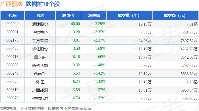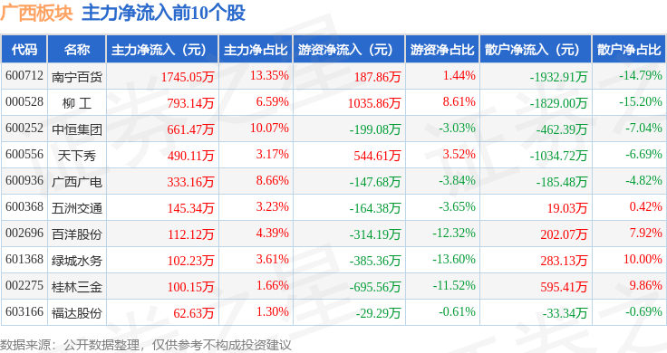 从资金流向上来看,当日广西板块主力资金净流出1.04亿元,游资资金净流出3442.13万元,散户资金净流入1.38亿元。广西板块个股资金流向见下表: