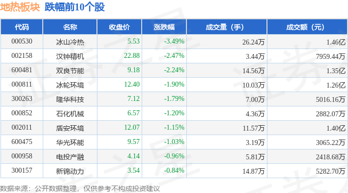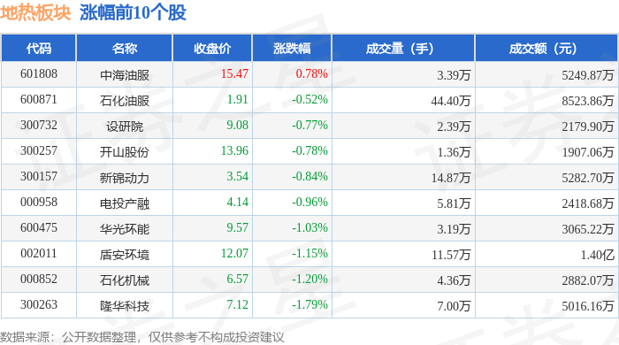 北向资金方面,当日地热板块北向资金持股市值为50.0亿元,减持0.15亿元。其中增持最多的是中海油服,增持了882.32万元。减持持最多的是石化油服,减持了0.14亿元。地热板块北向资金持股变动明细见下表: